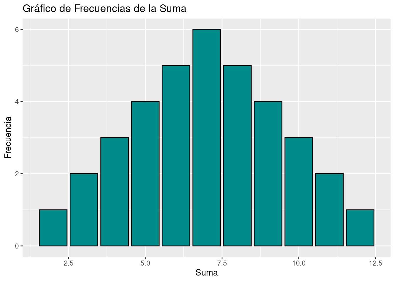 La ocurrencia de algunos eventos (como la suma o promedio de dos dados) tienen una probabilidad determinada, lo que genera una distribución teórica de probabilidad.