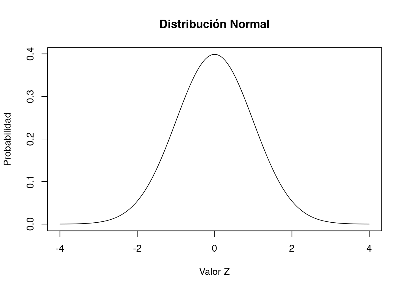 plot(x_values,y_values,type="l",xlab="Valor Z",ylab="Probabilidad",main="Distribución Normal")