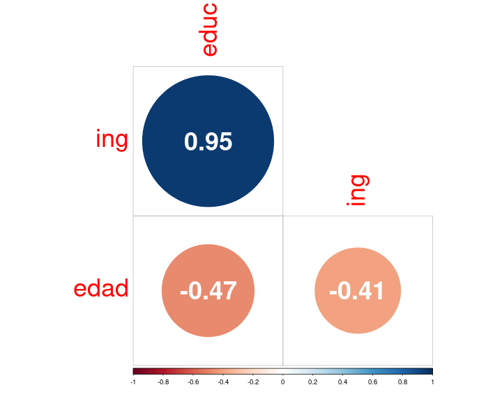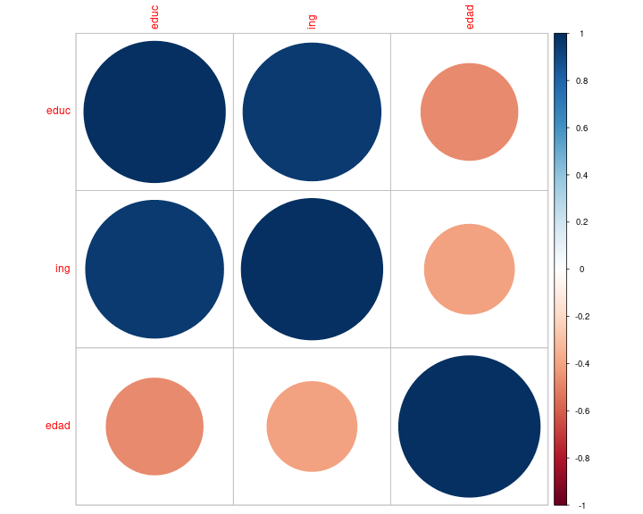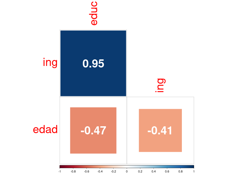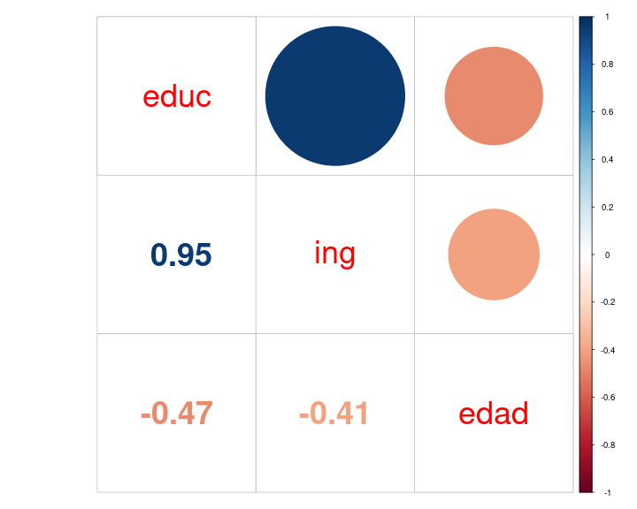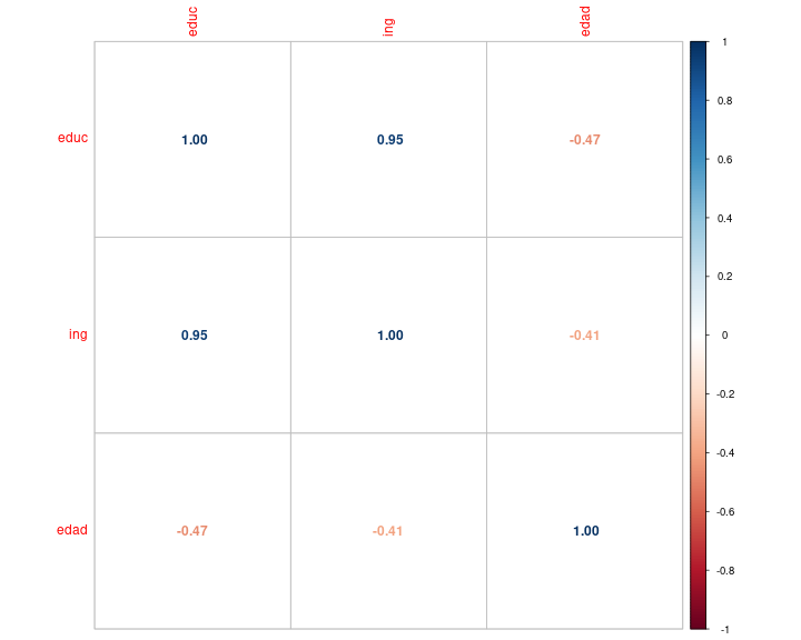 educ ing edadeduc 1.0000000 0.9512367 -0.6693607ing 0.9512367 1.0000000 -0.4941732edad -0.6693607 -0.4941732 1.0000000