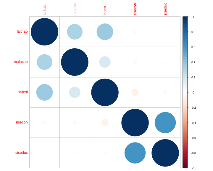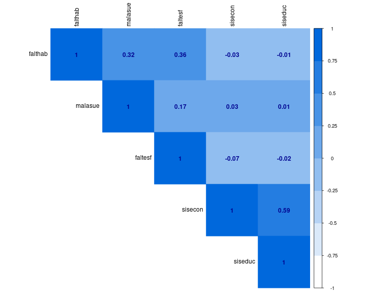 falthab malasue faltesf sisecon siseducfalthab 1.000000000 0.31793357 0.36246039 -0.02787884 -0.005893529malasue 0.317933565 1.00000000 0.16936872 0.02755708 0.013865045faltesf 0.362460395 0.16936872 1.00000000 -0.06579454 -0.020114542sisecon -0.027878843 0.02755708 -0.06579454 1.00000000 0.593625639siseduc -0.005893529 0.01386504 -0.02011454 0.59362564 1.000000000