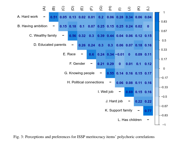 corrplot::corrplot(cormat, method = "color", addCoef.col = "#000390", type = "upper", tl.col = "black", col=colorRampPalette(c("white","#0068DC"))(8), bg = "white", na.label = "-")
